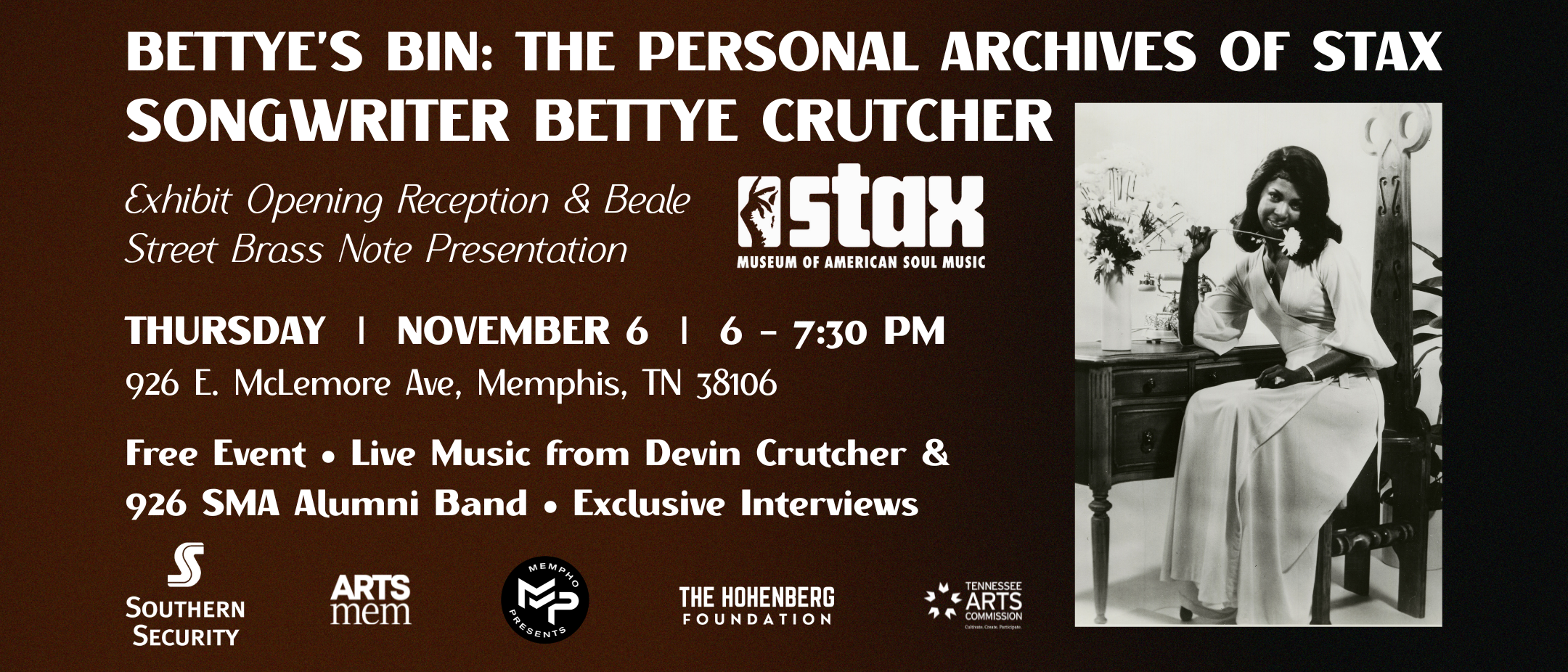 Join us for the opening reception of Bettye’s Bin: The Personal Archives of Stax Songwriter Bettye Crutcher. A new limited-time exhibit celebrating one of the most remarkable voices in soul music history.