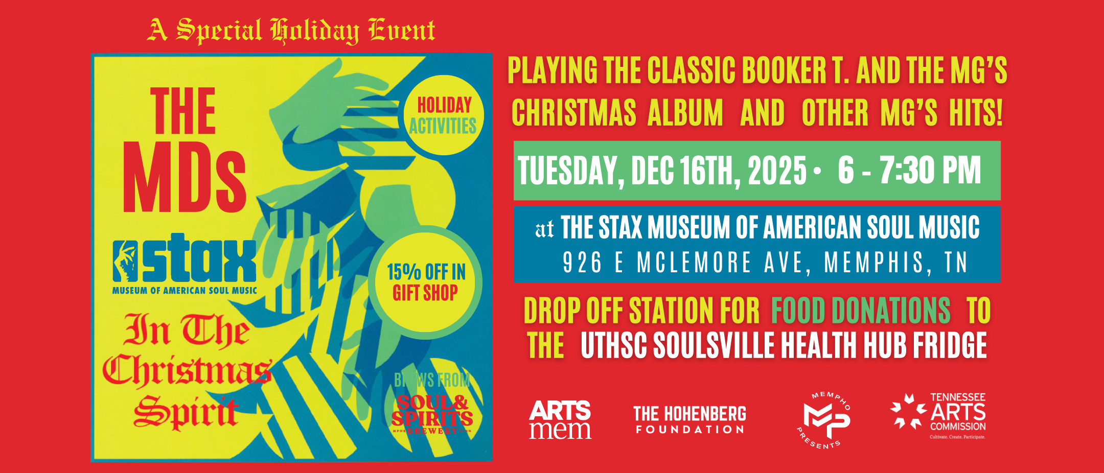 Mark your calendars and join us at the Stax Museum’s Annual Holiday Party: In The Christmas Spirit with The MDs, including holiday activities, special beer brews from Soul & Spirits + additional refreshments, and more surprises to come! The museum gift store will be 15% off: get some soul for the whole family!